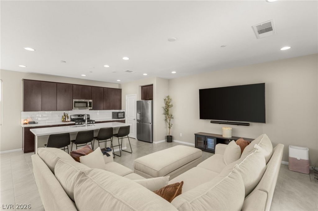 Rare opportunity to own an immaculate home in the desirable Summerlin West community of Obsidian! Sitting on a corner homesite this property offers a stunning, stacked stone exterior elevation with a private courtyard. Upon entry you are greeted with modern tile flooring leading into a generous bedroom downstairs with full ensuite, perfect for private guest quarters. Modern, mission style railing leads you upstairs into a massive open concept living area flooded with natural light. You will love the rich wood cabinetry, slab quartz island, stainless appliances, deco backsplash, and view deck with mountain sightlines. Passing the powder bath you lead upstairs to another bedroom with ensuite. Primary bedroom offers a huge closet, private balcony, spa shower with dual vanities and laundry room at hall for convenience. You are minutes from Downtown Summerlin, Whole Foods, Red Rock, restaurants, shopping and brand new Grand Park!