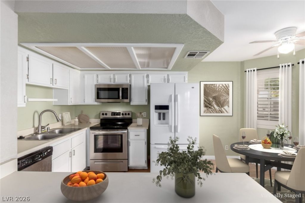 Move-in ready 2-bedroom, 2-bathroom ground-floor condo in Rock Springs Vista, Northwest Las Vegas, minutes from Summerlin. Features woodgrain flooring, stainless steel appliances, a wood-burning fireplace, and custom shutters with security locks. Fully updated with smooth ceilings (popcorn removed), refreshed kitchen and bathroom cabinets, and a freshly painted primary bedroom. A brand-new high-efficiency AC unit combined with a sun-sheltered unit orientation keeps the home naturally cooler and electric bills significantly lower than comparable units. HOA includes pools, spas, and beautifully maintained grounds. Enjoy walkable access to Summerlin's top shopping, dining, and parks, plus quick connections to US-95 and the 215 Beltway. Red Rock Canyon is minutes away. Comfort, style, and location - this one checks every box.
