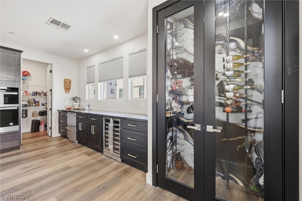 Experience the pinnacle of modern living in this impeccably upgraded 3-story residence, completed in 2025. Designed for the Urban Core lifestyle, this home surpasses model-home standards with high-end finishes and a versatile floor plan. The first level features a private suite with a full bath & a walk-in closet, perfect for multi-generational living or a secluded home office. The main living area showcases an open-concept layout, premium LVP flooring, a sophisticated modern wine display, and a chef's kitchen featuring an extended butler's pantry w/ Wine cooler, Beverage fridge and a Smart Refrigerator. Engineered for efficiency and convenience with Solar panels, a pristine epoxy garage floor, and designer upgrades rarely found in typical builder specs. Located in the heart of Summerlin West, you are minutes from premier shopping, dining, top-rated schools, and scenic mountain trails. Skip the construction wait and move into this turn-key masterpiece today! Must See!