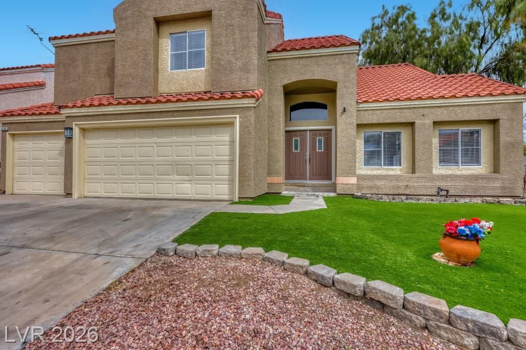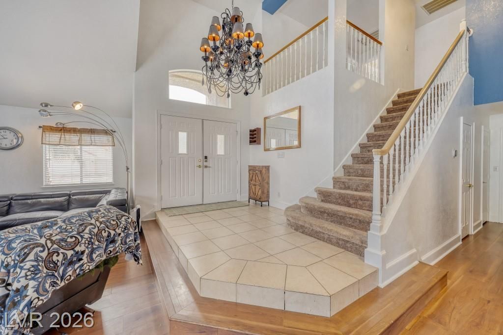 Beautiful 3 bed, 2.5 bath pool home in the Green Valley neighborhood of Henderson with primary bedroom on the first floor?a major plus for buyers seeking convenience without stairs. Primary suite includes walk-in closet, separate tub and shower, double sinks, & direct access to the backyard, plus a powder room downstairs for guests. Open layout with vaulted ceilings in the living and dining area and a separate family room with fireplace. First floor features all hard surface flooring with wood and tile. Kitchen includes granite countertops, stainless steel appliances, and an upgraded refrigerator . Laundry room is downstairs with washer & dryer included. Upstairs includes two additional bedrooms, each with its own sink and shared tub/toilet area, plus loft space. Brand new carpet on stairs & in all bedrooms. Backyard features heated pool & spa with safety fencing, covered patio, & two separate yard areas. Near Green Valley High School, Galleria Mall, & multiple shopping areas.