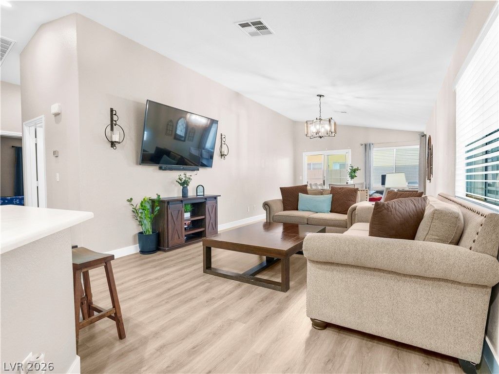 Move-in ready & packed with upgrades, this beautifully remodeled single-story home sits on an oversized corner lot with a spacious backyard and one less neighbor! Step inside to find brand new luxury vinyl plank flooring throughout, offering a modern, seamless look with no carpet anywhere. Vaulted ceilings create an open, airy feel, enhancing the home's inviting layout. The updated kitchen features sleek stainless steel appliances and flows effortlessly into the living and dining areas, making it ideal for hosting. Both bathrooms have been tastefully renovated with new vanities, adding a fresh and contemporary touch. Outside, enjoy a rare find in Las Vegas...a large backyard with real grass and plenty of room to entertain. Located in a gated community with its own park, this home offers both privacy and convenience. Solar panels are already installed, providing added energy efficiency, especially for the summer time. This won't last long!