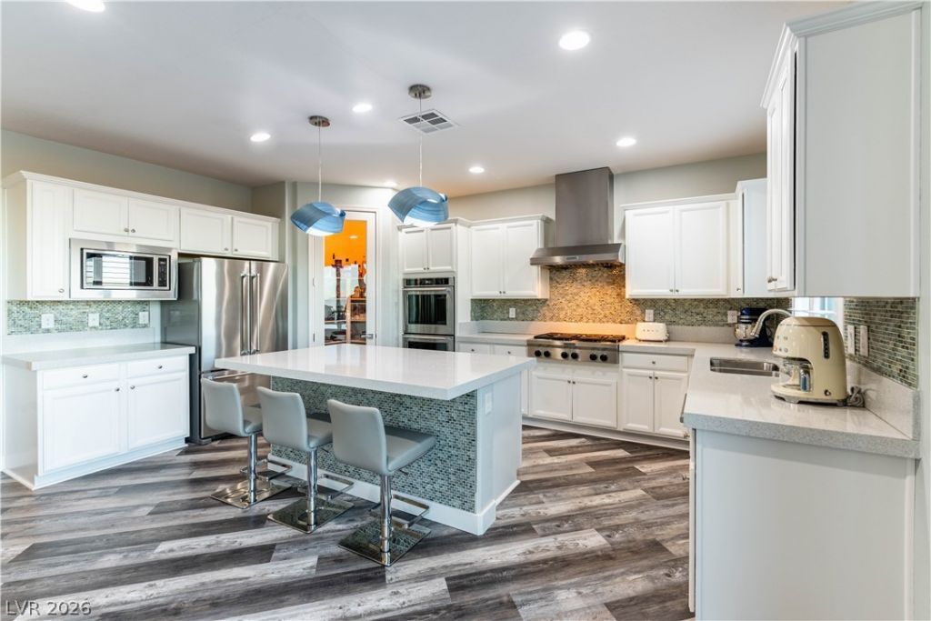 This West Summerlin beauty features panoramic strip, mountain, & city views from the rooftop deck & main living area balcony! This home is well appointed w/luxury vinyl plank flooring, plantation shutters, Ecobee thermostats, Vivint alarm system w/prewired cameras, & tankless water heater. The unique layout of this home is extremely functional. On the 1st level you have a large family room/living area, the primary BR, primary bathroom, laundry room, & backyard access. It's like your own private space away from the rest of the main living area! The 2nd floor features the large family room, large dining area, & a large gourmet kitchen w/huge quartz island w/bar seating, and Pro KitchenAid SS appliance package w/dual ovens and 6 burner range! There is also a den/office, a hall bathroom, 2 secondary Br's w/walk-in closets, & a staircase to the incredible rooftop deck! The private yard has a large covered patio & relaxing firepit! Only minutes from the best schools & Downtown Summerlin!