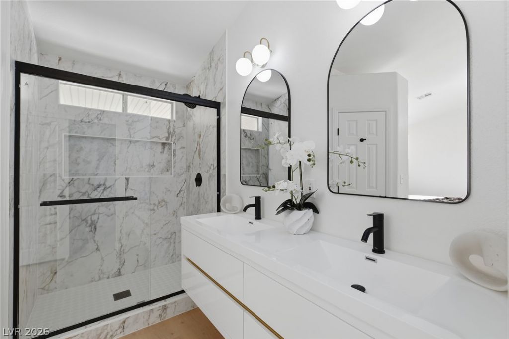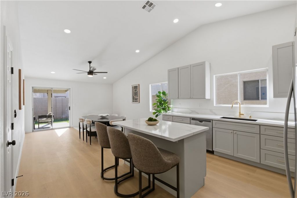 *** Now accepting FHA!***Welcome to this move-in ready, beautifully remodeled 3-bedroom home in the Silverwood Ranch community! Home includes a spacious backyard with an attached covered patio. Conveniently located with quick access to I-11 and less than 10 minutes from North Las Vegas Airport. Inside, enjoy vaulted ceilings, abundant natural light, modern light fixtures, a stylish accent wall, ceiling fans, plush carpet, and laminate wood flooring throughout. The custom kitchen offers a garden view, recessed lighting, upgraded countertops, custom cabinetry with elegant gold hardware, and a large island with seating?perfect for entertaining. Contemporary bathrooms showcase dual floating vanities with framed mirrors, custom lighting, sleek tiled showers with built-in niches, and luxurious rainfall shower heads. Stylish, modern, and ready to call home!