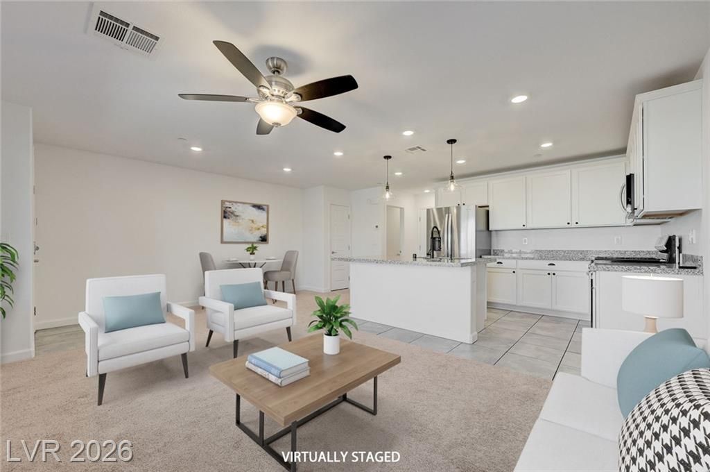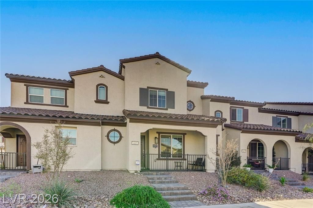 Welcome home! This charming, move-in ready townhome is immaculate, well cared for and ready for new owners! A covered front porch greets you and welcomes visitors to this open floor plan home. Soaring 10-foot ceilings and natural light make this home ready for entertaining and everyday living. Tasteful updates in the kitchen include new stainless steel appliances, white cabinets and center island. Built in 2022 this home provides extra storage and an attached 2-car garage. Located in the sought-after Cadence community resort style living is just steps away. Amenities galore including pool, splash pad, parks, jogging paths, sports courts and more! Easy access to I-11/95 and the 215 along with nearby restaurants, shopping. Don't miss this opportunity!