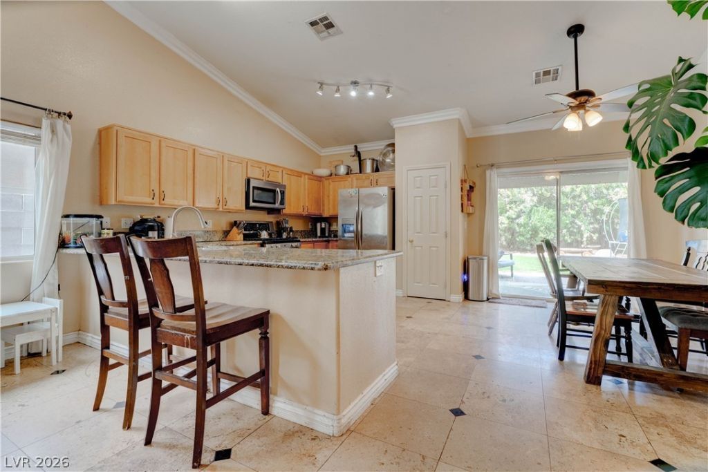 Step inside this 1 story home to find elegant travertine tile flooring throughout the main living areas, with carpet in the bedrooms. The open-concept layout creates a seamless flow between the spacious living room and kitchen, highlighted by vaulted ceilings and crown molding that add both style and charm. The kitchen features Giallo Ornamental style granite countertops, providing both beauty and functionality for everyday living and entertaining. The thoughtfully designed floor plan offers a private primary suite on one side of the home, with two additional bedrooms situated on the opposite side for added privacy. Enjoy outdoor living in the low-maintenance backyard complete with artificial turf and a covered patio that faces north?perfect for relaxing in the shade and enjoying comfortable evenings outdoors. Just minutes from Deer Springs Town Center, offering convenient access to popular shopping and dining including Home Depot, Kohl's, Michaels, PetSmart, and much more.