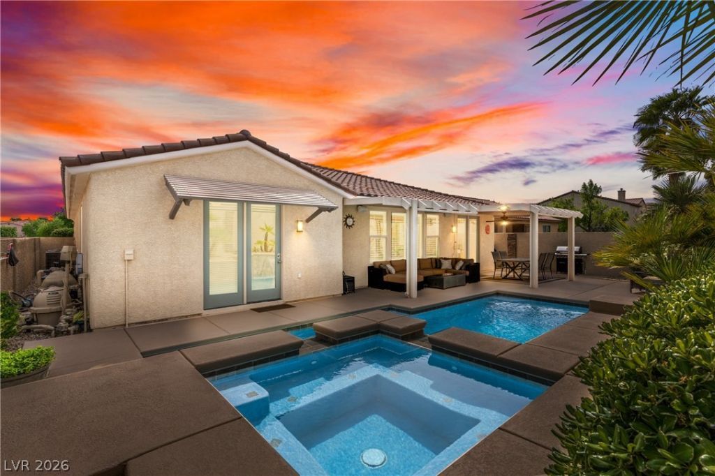 Highly upgraded home on a quiet cul-de-sac in Southwest Las Vegas with prime access to shopping, dining, parks, and top-rated schools. Minutes to the 215, Durango Casino, The Strip, and Red Rock Canyon. Features include tile flooring throughout, crown molding, plantation shutters, new baseboards, and a remodeled primary bath with oversized soaking tub. Kitchen offers ample cabinetry, new 5-burner gas range, and newer GE Profile appliances. Private backyard retreat with pool/spa (saltwater ready), cool deck, awnings, and landscape lighting. Includes natural gas BBQ, firepit, and surround sound. Additional upgrades: whole-home water filtration, central vacuum, hot water recirculator, dual-zone HVAC, security system, custom gates, and deep garage bay for boat storage.