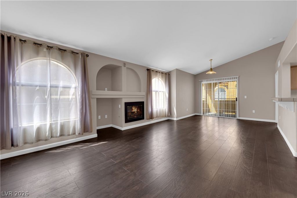 Come see this 2 bedroom 2 bath located conveniently near Flamingo and Durango. This 2nd floor home features a high ceiling in the main living room with a gorgeous fireplace and dark wood flooring. This property has a newly installed water heater and refrigerator