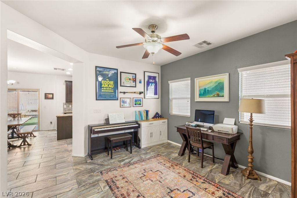Welcome to this beautifully maintained home in the desirable northwest Las Vegas area near Skye Canyon. Designed for both comfort and functionality, the open-concept layout seamlessly connects the main living, dining, and kitchen areas. Ideal for everyday living and entertaining. The kitchen offers ample cabinetry, generous counter space, and modern finishes for added convenience.Upstairs, spacious bedrooms provide flexibility for family, guests, or a home office, while the primary suite serves as a private retreat with an en-suite bath and walk-in closet. Step outside to your own backyard oasis featuring a sparkling pool and low-maintenance turf, perfect for relaxing, entertaining, or enjoying year-round outdoor living without the upkeep. Conveniently located near parks, shopping, dining, schools, and easy freeway access, this home offers the ideal blend of comfort, style, and location