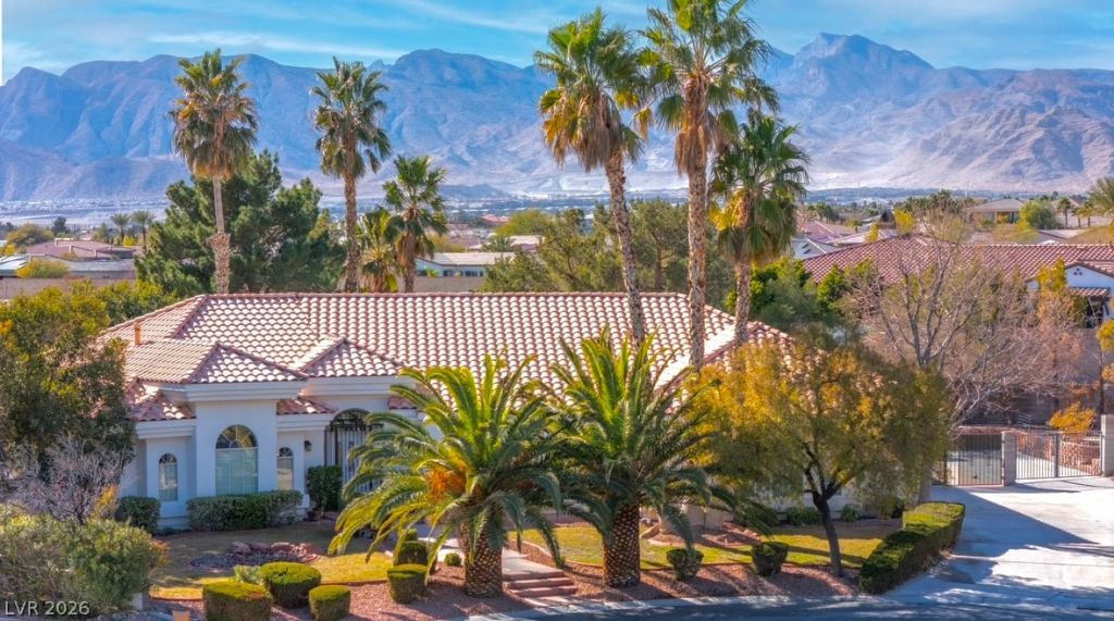 This stunning single-story home in a non-HOA community in Northwest Las Vegas offers 3,067 sqft of well-designed living space on a half-acre estate. Featuring 4 bedrooms, 3 bathrooms, a den, formal living and family rooms, a 3-car garage, and RV parking, this property is ideal for relaxing and entertaining. The open floor plan boasts high ceilings, a chef's kitchen with granite countertops, stainless steel appliances, and an island cooktop, plus two inviting living spaces with fireplaces. The primary suite is a private retreat with a custom walk-in closet, jetted tub, dual sinks, and backyard access. Additional bedrooms include a flexible fourth room with French doors for use as an office. The park-like backyard offers a pool, spa, gazebo, mature landscaping, fruit trees, and a covered patio?perfect for gatherings. A gated front entry, side garage, and RV parking add functionality. Close to the 215, shopping, and dining, this move-in-ready home combines elegance and comfort.