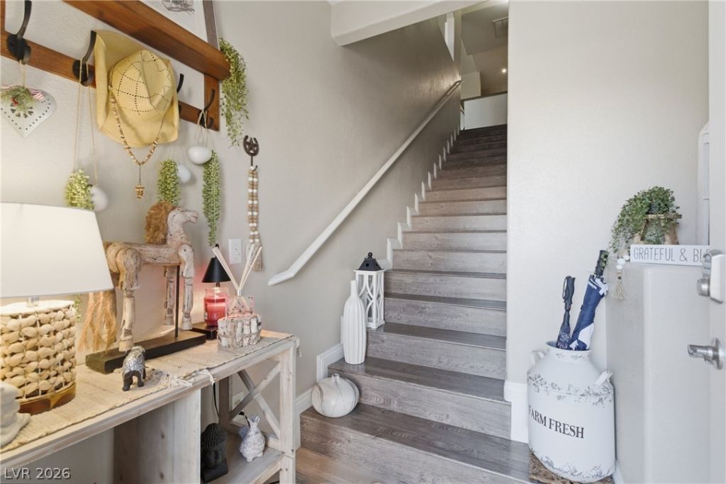 Welcome to this beautifully updated 2-bedroom, 2-bath upper-level condo in Chateau Nouveau, located in the desirable southwest area of Las Vegas near Summerlin. This light-filled home features vaulted ceilings, an open layout, and a cozy fireplace. The upgraded kitchen offers white cabinets, granite countertops, a tile backsplash, and stainless steel appliances. Both bedrooms include walk-in closets, ideal for dual primary living. Enjoy modern flooring, stylish finishes, a private balcony, and in-unit laundry. Community amenities include gated access, pools, spa, and fitness center. Conveniently close to shopping, dining, and freeway access.
